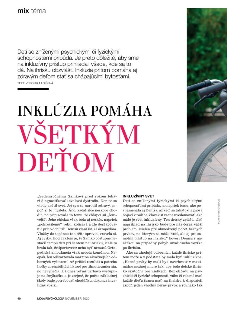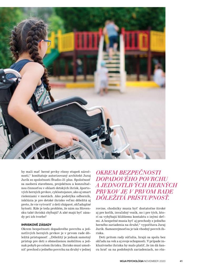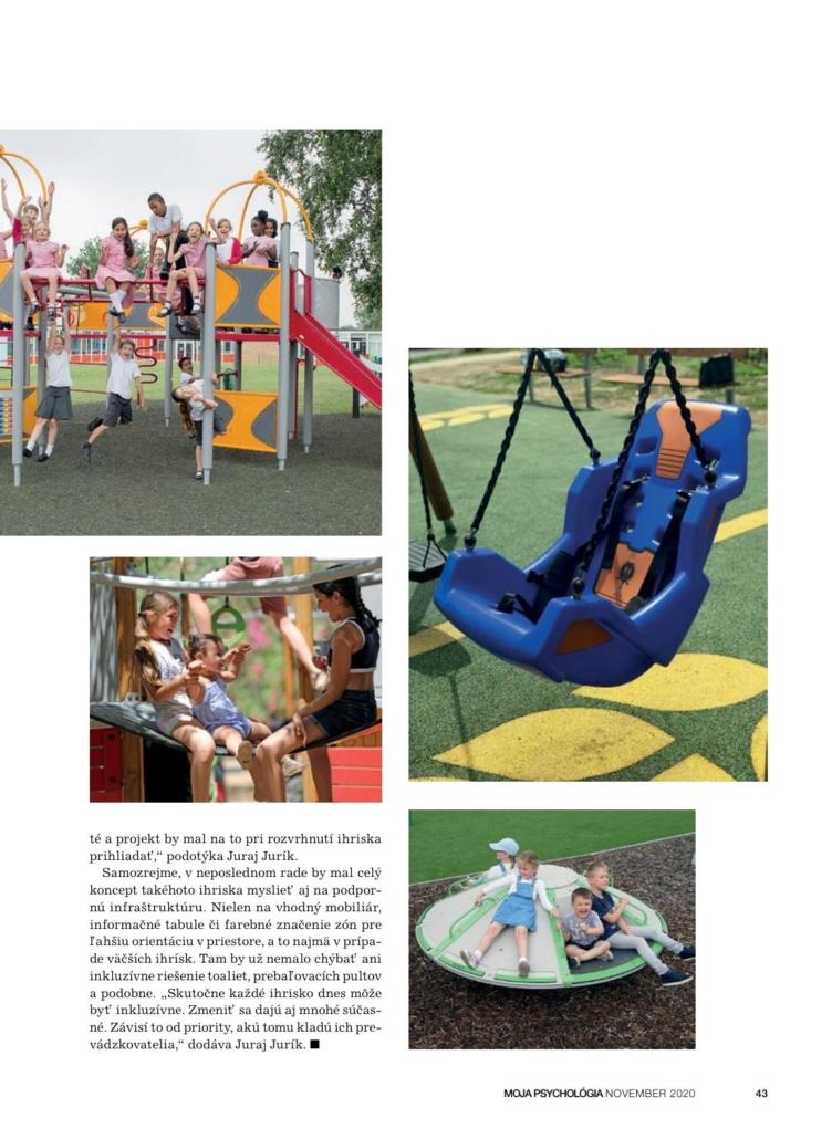 Detí so zníženými psychickými či fyzickými schopnosťami pribúda. Je preto dôležité, aby sme na inkluzívny prístup prihliadali všade, kde sa to dá. Na ihrisku obzvlášť. Náš autorizovaný architekt Juraj Jurík hovorí k téme pre časopis Moja psychológia.