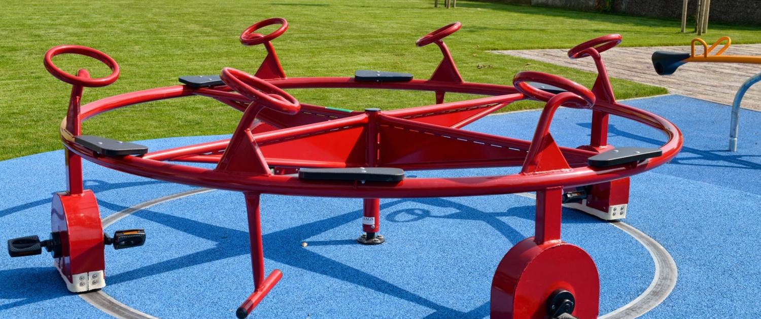 Ihrisko sa nachádza v areáli mestského úradu a vodný motív je neprehliadnuteľný. „Vodný motív je použitý už na bezpečnom dopadovom povrchu tlmiacom pád, kde sme vybrali modrú farbu,“ podotýka autorizovaný architekt spoločnosti Studio 21 Juraj Jurík. Výhodou povrchu od renomovaného dodávateľa Playtop je nielen to, že je vďaka vysokej kvalite a trvácnosti takmer bezúdržbový, ale že je ho možné tvarovať aj v priestore, čo sme využili aj na rozdelenie jednotlivých herných zón. Na vyvýšenej časti akoby rozčerenej vodnej hladiny sa nachádza pedálový kolotoč určený pre viac detí. Práve vyvýšenie plochy umožňuje pri rozkrútení kolotoča vytvoriť z neho bezpečný priestor a neohrozuje tak „dolu“ šantiace deti na iných herných prvkoch. Zároveň však umožňuje aj menším deťom mať zhora z kolotoča neopakovateľný pohľad na všetky strany.